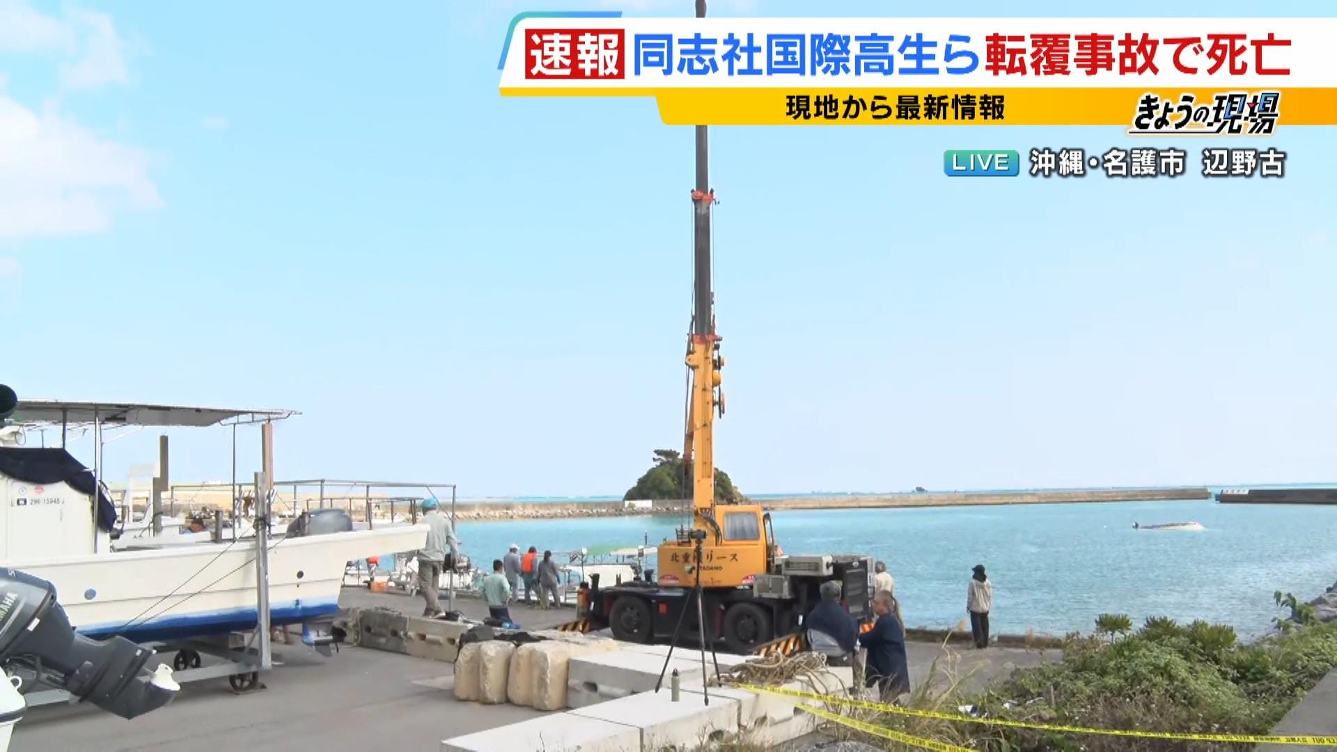 「名護市辺野古からお伝えします。私の後ろにクレーンがあり、こちらで転覆した船を引き上げる作業が行われています。