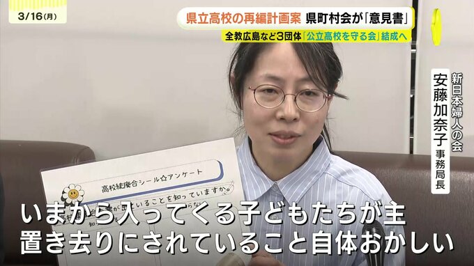 一方、県内の小・中学校の教職員でつくる全教広島など3つの団体は、県立高校の再編計画に反対する「広島の公立高校を守る会」の結成を発表しました。