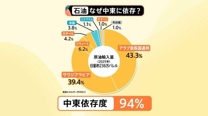 石油の輸入先は、アラブ首長国連邦が43.3%、サウジアラビアが39.4%と、中東依存度は94%となっています。