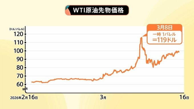 WTI原油先物価格は、3月頭ごろの1バレル=約70ドル程度から、3月8日には一時1バレル=119ドルまで上がりました。