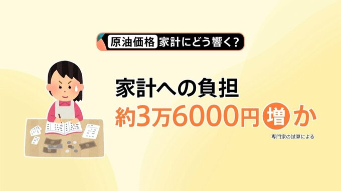 専門家の試算によると、このまま原油価格が高騰したとして、家計の負担は年間で約3万6000円増えるということです。