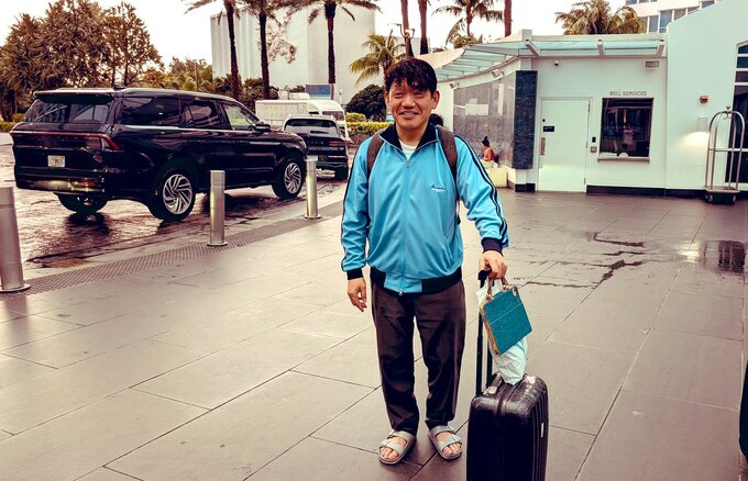 さらに飯尾さんは、「飯尾家長男は熱闘の17時間後に 出川さん中岡達が待つマイアミに到着」と綴り、サンダルにジャージ姿でキャリーケースを引く写真も掲載。