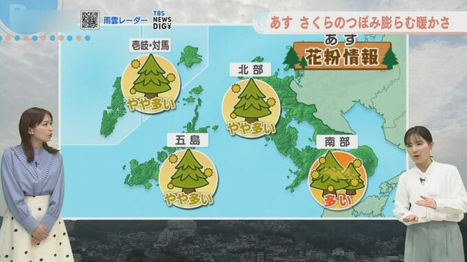 あすの花粉情報です。スギの飛散ピークが過ぎてヒノキ花粉がまだ本格的に飛び始めていない「はざまの時期」にあたります。長崎南部では「多い」、そのほかの地域は「やや多い」の予想です。