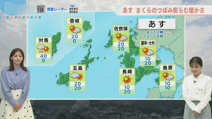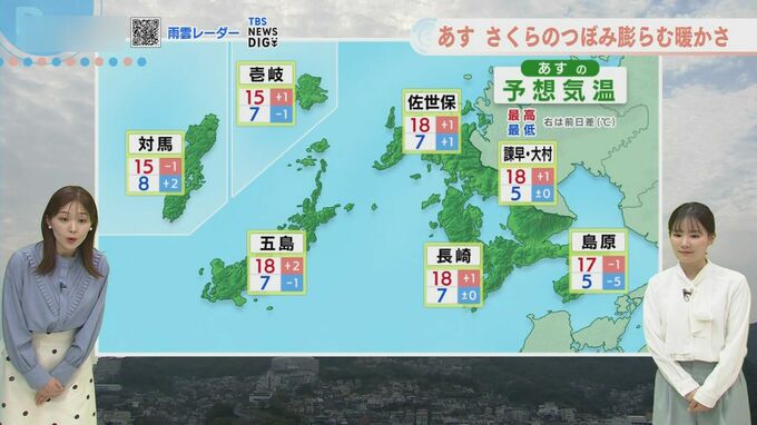 最高気温は長崎・佐世保・五島・諫早・大村で18℃予想です。
