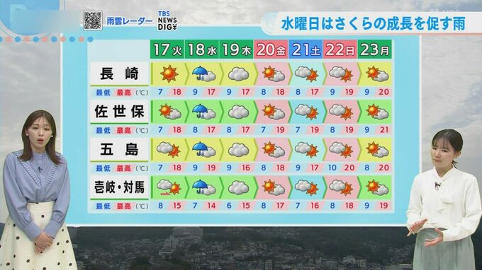 3月16日(月)の最高気温は長崎・佐世保ともに17.1℃を記録しました。きょうは全国的に桜の話題が相次ぎ、高知県・岐阜県・山梨県で開花が発表されています。