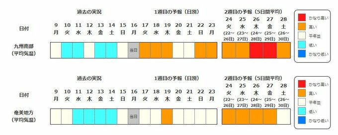 九州南部・奄美地方の向こう2週間の気温は、暖かい空気が流れ込みやすいため高く、23日頃からはかなり高くなる可能性があります。