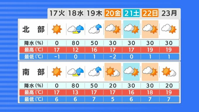降水確率は、1日通して0%。日中の最高気温は、16~17℃の予想で、4月並の地点も出てくる見込みです。