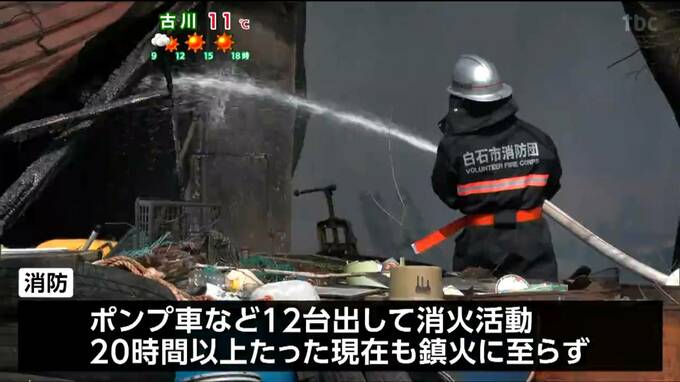 16日午前、宮城県白石市内の資材置場から火が出て、住宅などに燃え広がった火事は、発生から20時間以上が経過した今も消火活動が続けられています。けがをした人はいないということです。
