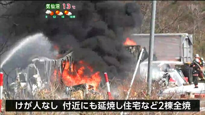 消防によりますとけが人はいませんが、火は付近の住宅などにも延焼し、少なくとも建物2棟が全焼したということです。