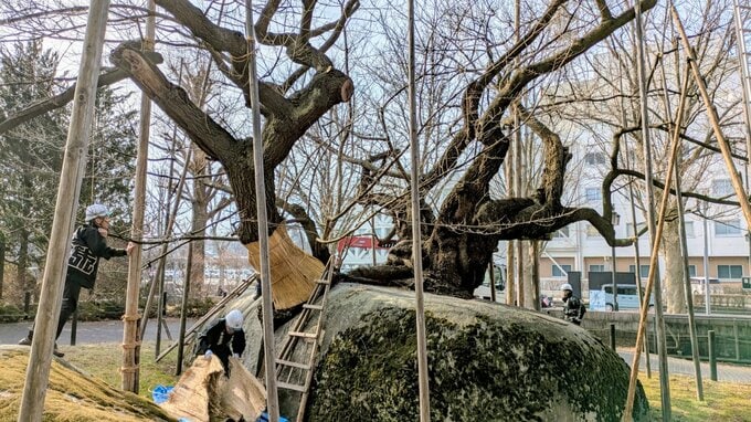 盛岡地方裁判所にある国の天然記念物「石割桜」で、幹や枝を守っていた「雪囲い」が取り外され、春の装いとなりました。17日は午前8時半ごろから、長年にわたり石割桜を管理している盛岡市の造園業者・豊香園の庭師…