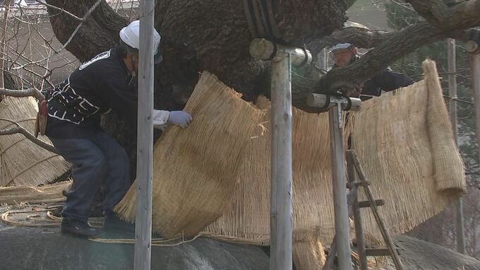 17日は午前8時半ごろから、長年にわたり石割桜を管理している盛岡市の造園業者・豊香園の庭師6人が、冬の期間寒さや病害虫から幹を保護するわら製の「こも」や雪の重さから枝を守る、およそ100本の縄と支柱を慎重に取り外しました。