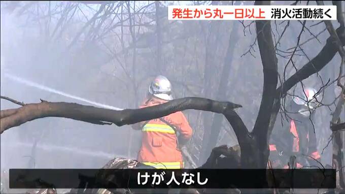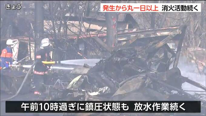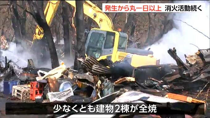 消防によりますと、火の勢いは収まり午前10時過ぎに鎮圧状態となりましたが、発生から丸一日が過ぎた今も重機で現場を掘削しながら放水を続けているということです。