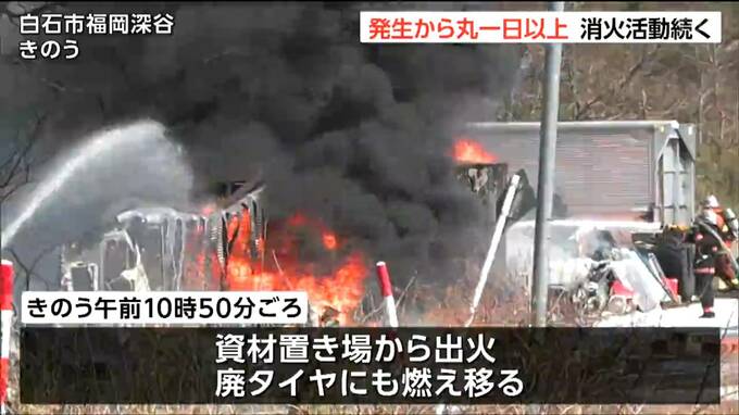 16日に宮城県白石市内の資材置き場から火が出た火事は、発生から丸一日が過ぎた17日も消火活動が続けられています。