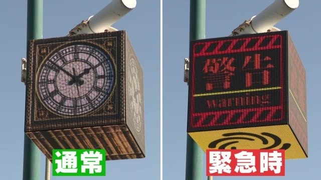 通常時は時計や広告を表示。緊急時には災害などの警報に切り替わる屋外用のデジタルサイネージ。これは、台風の直撃を度々受ける沖縄の那覇市で導入されています。