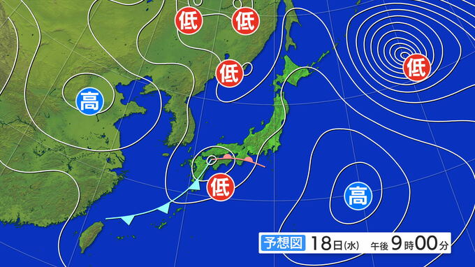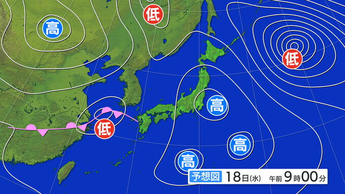 あす18日(水)は「低気圧」が前線を伴って、九州北部を通過する見込みです。