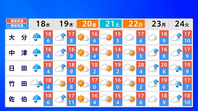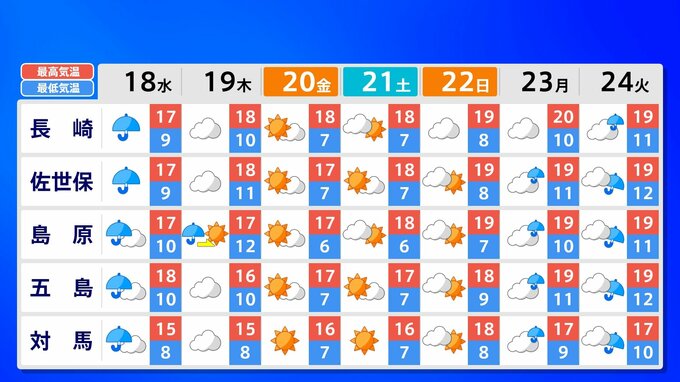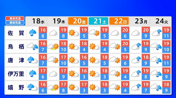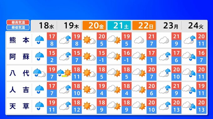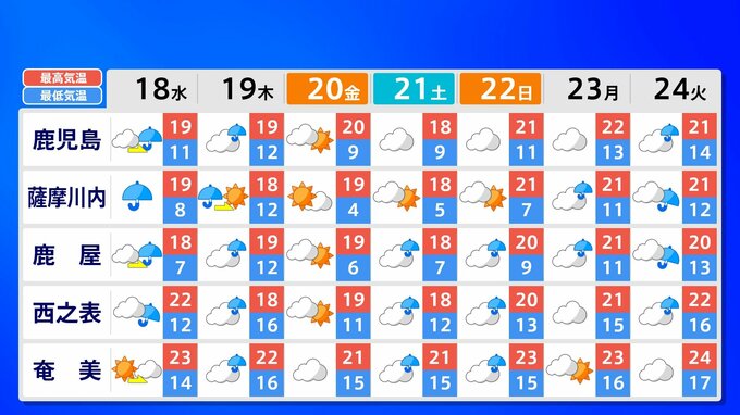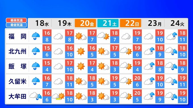 【低気圧通過】あす九州は雨 強風にも注意【雨のシミュレーション18日(水)~19日(木)/九州各都市の週間予報(3連休の天気)】福岡・佐賀・長崎・大分・熊本・宮崎・鹿児島 南日本放送 2026年3月17日(火) 12:08 国内 天気 九州地方 各都市の週間予報(18日(水)~ 25日(火)) 週間予報を画像で掲載しています(各都県5か所ずつ)。福岡県の場合、福岡市・北九州市・飯塚市・久留米市・大牟田市です。 20日(金)からの3連休は、九州北部地方は晴れる所が多いですが、九州南部地方はくもりがちでしょう。