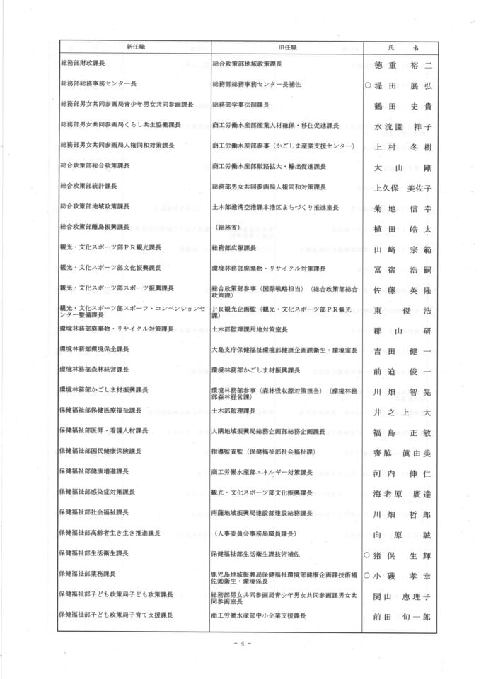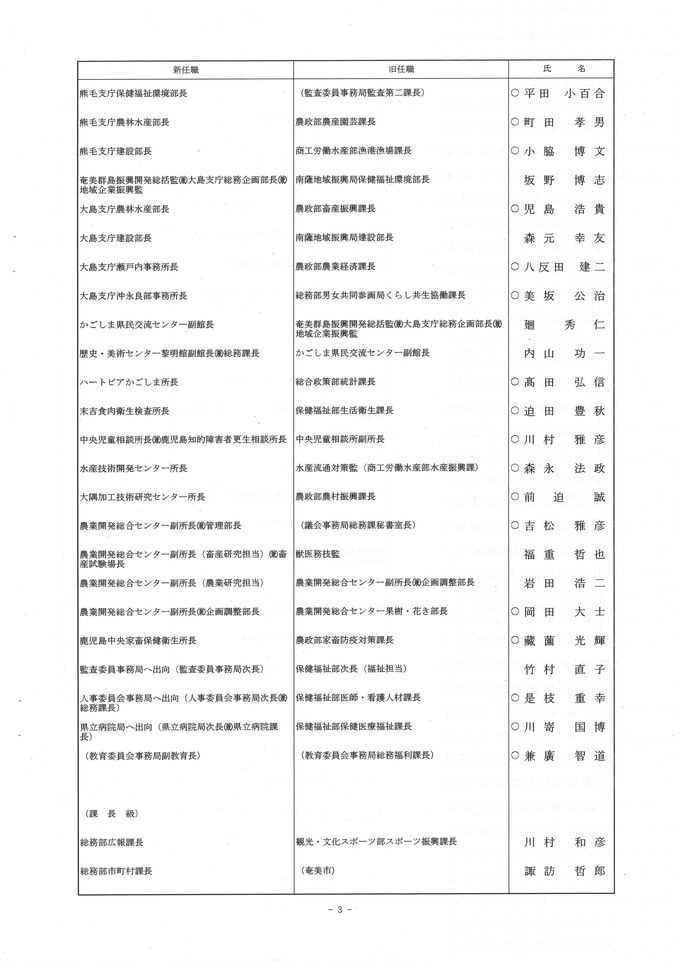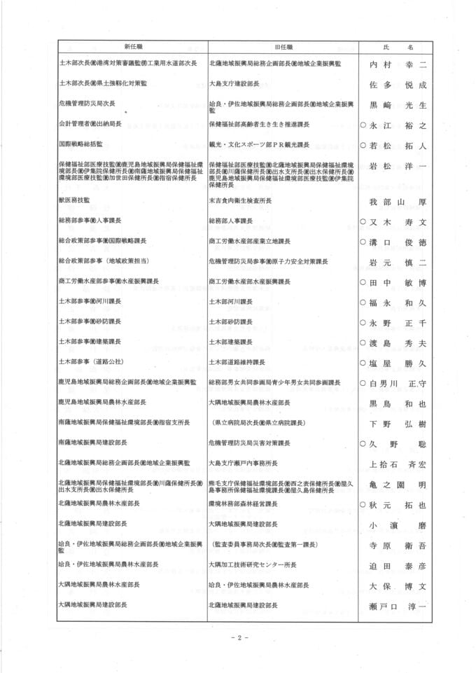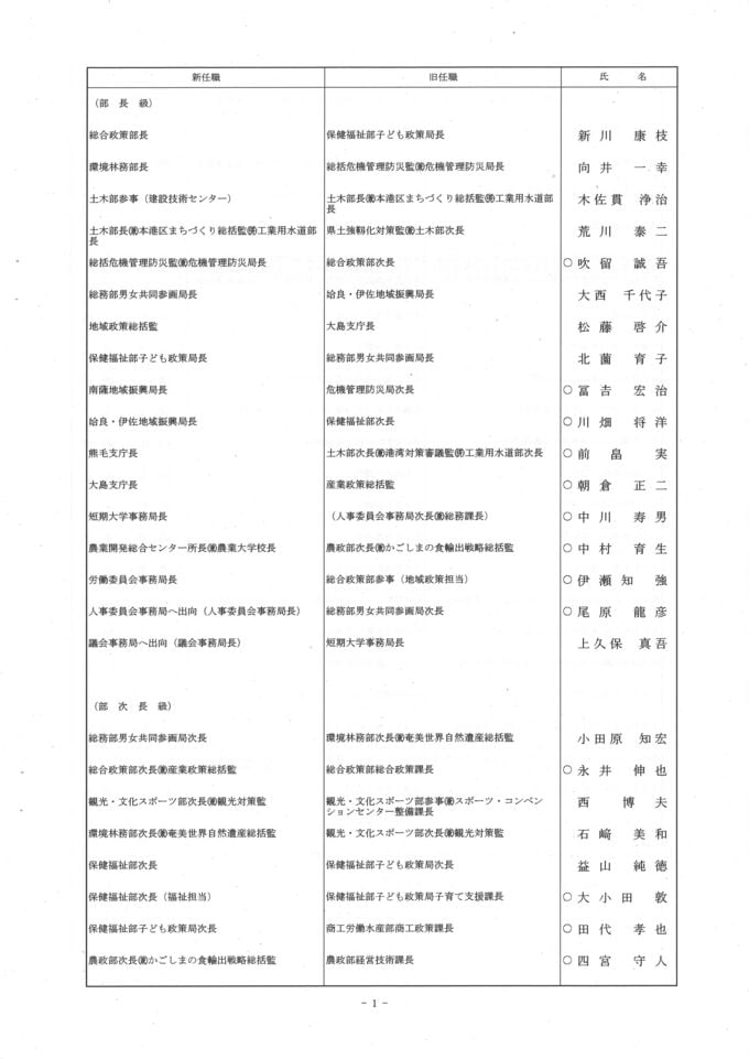 鹿児島県 人事異動一覧2026 部長・部次長・課長級・課長補佐級・係長級・一般職員【鹿児島県庁異動名簿】令和8年 南日本放送 2026年3月17日(火) 18:48 国内 部長級・部次長級~ 画像はタップやクリックで拡大できます ▼(リンク)部長級・部次長級~ ▼(リンク)部次長級続き~課長級 ▼(リンク)課長級~▼(リンク)課長補佐級・係長級・一般職員 部次長級・課長級~ 画像はタップやクリックで拡大できます ▼(リンク)部長級・部次長級~ ▼(リンク)部次長級続き~課長級 ▼(リンク)課長級~▼(リンク)課長補佐級・係長級・一般職員