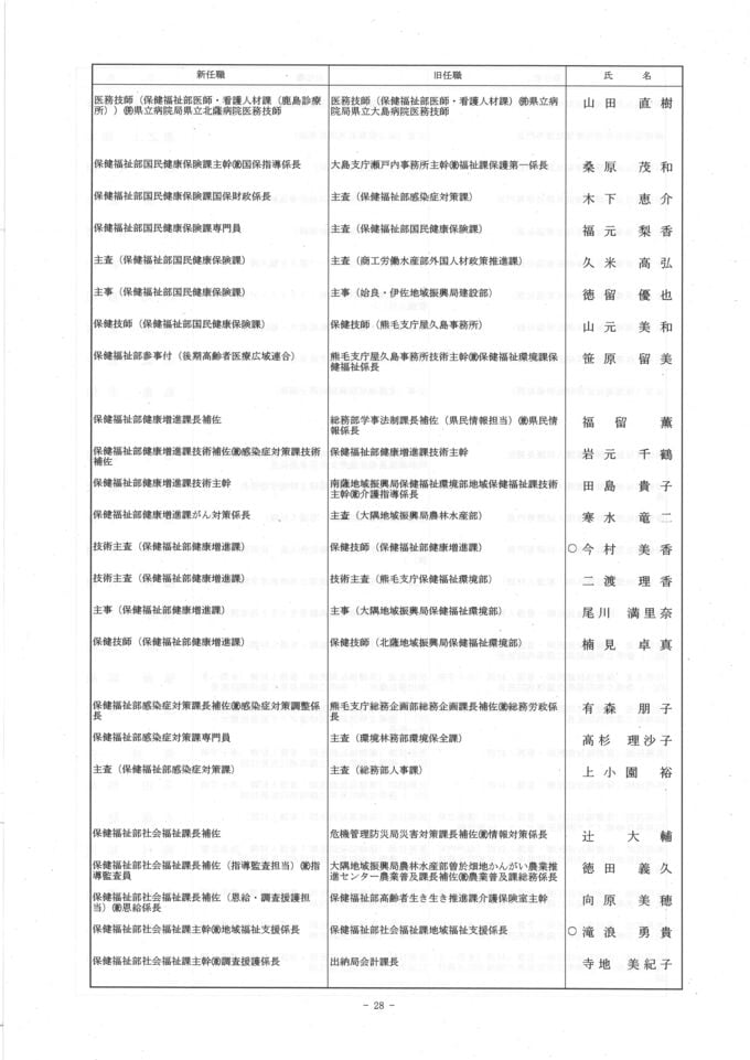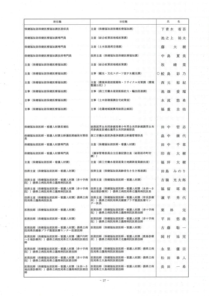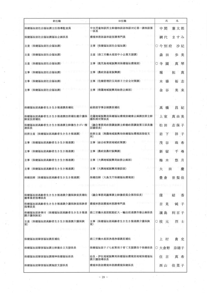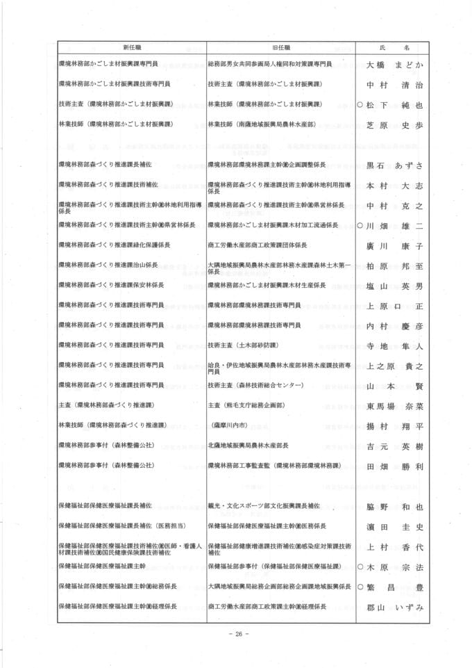 鹿児島県 人事異動一覧2026 部長・部次長・課長級・課長補佐級・係長級・一般職員【鹿児島県庁異動名簿】令和8年 南日本放送 2026年3月17日(火) 18:48 国内 ▼▼(リンク)部長級・部次長級~ ▼(リンク)部次長級続き~課長級 ▼(リンク)課長級~▼(リンク)課長補佐級・係長級・一般職員