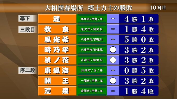 大相撲春場所10日目、郷土力士の取り組みの結果です。