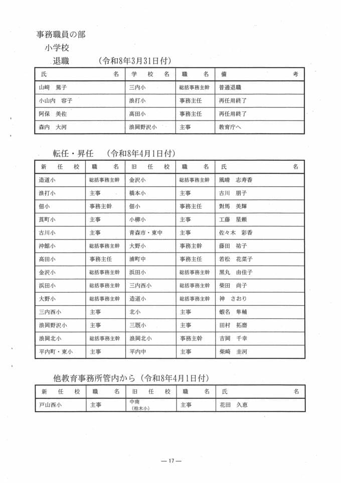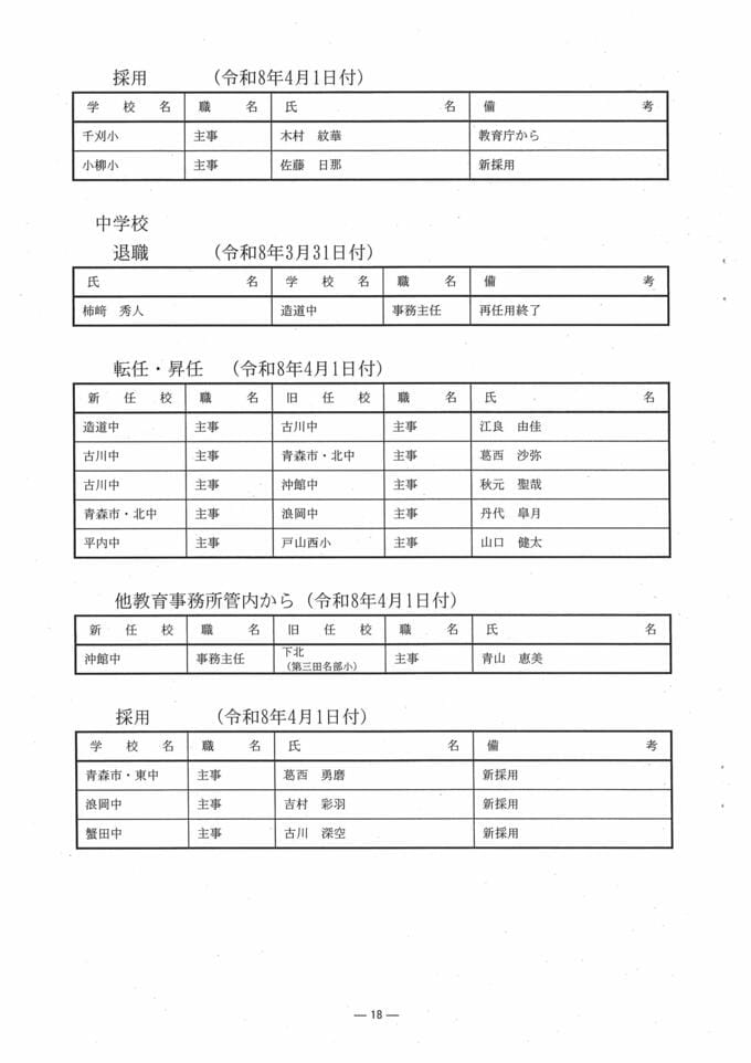 青森県 教職員人事異動一覧2026