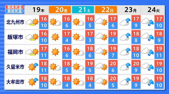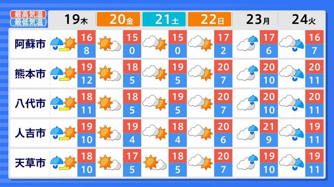 熊本は、19日、23日、24日に雨の時間帯がありそうです。