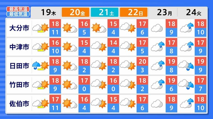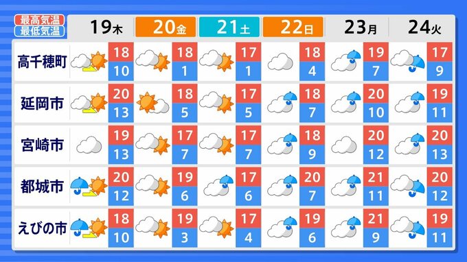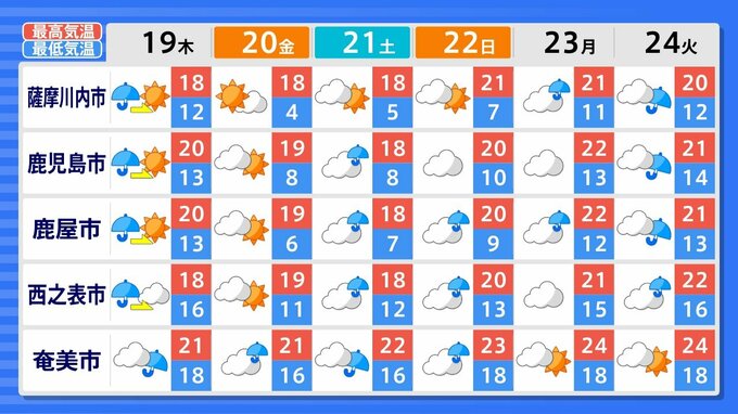 宮崎、鹿児島は、19日から24日にかけて曇りや雨の日が多くなりそうです。