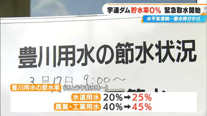 豊川用水の節水率はきょう午前9時から、水道用水は20%→25%、農業・工業用水は40%→45%に引き上げられました。
