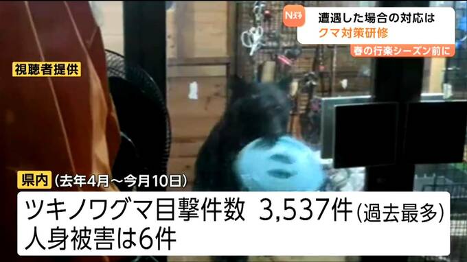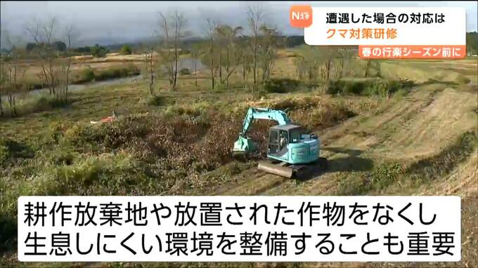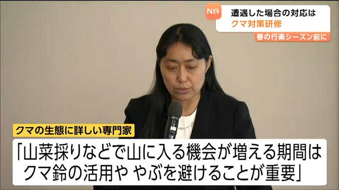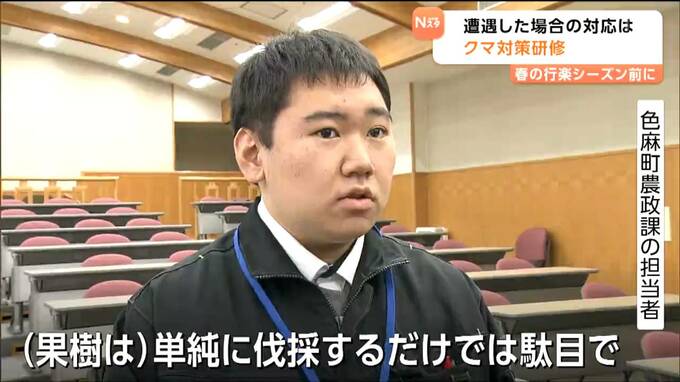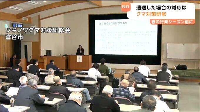 春の行楽シーズンを前にクマへの対策です。農林水産業や鳥獣対策の従事者を対象にしたクマ対策の研修会が17日に開かれ、参加者が、遭遇した場合の対応や生息しない環境づくりなどについて確認しました。