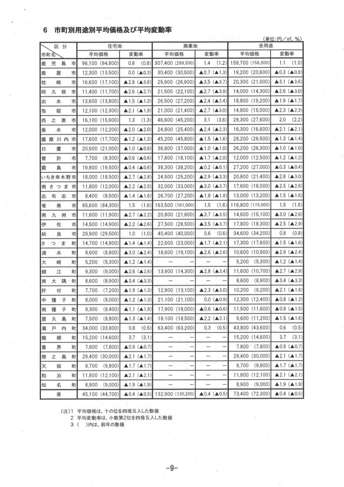 【公示地価2026】鹿児島県内の公示地価一覧 全地点掲載【令和8年地価公示】3月発表最新データ 南日本放送 2026年3月18日(水) 00:01 国内 鹿児島県内全市町村の住宅地、商業地、全用途の平均価格と平均変動率は画像で掲載 鹿児島市の住宅地の平均価格は96,100円、商業地の平均価格は307,400円、全用途は159,700円でした。 そのほかの市町村のデータは画像で掲載しています。