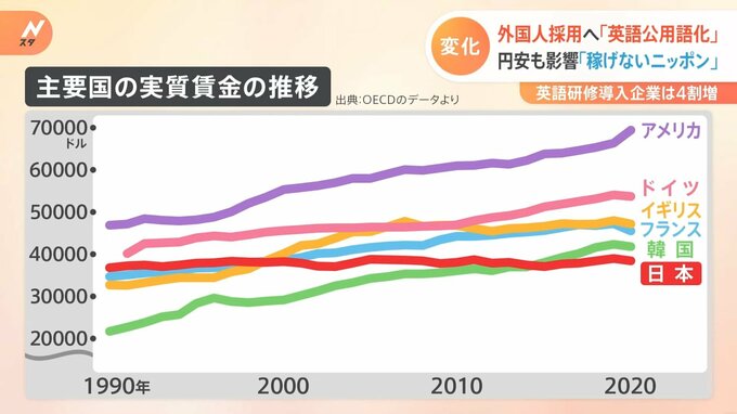 外国人にとって日本は「稼げない国」になっていることから、「英語の公用語化」などで少しでも働きやすい環境を整えようという考えが広がっているというのです。