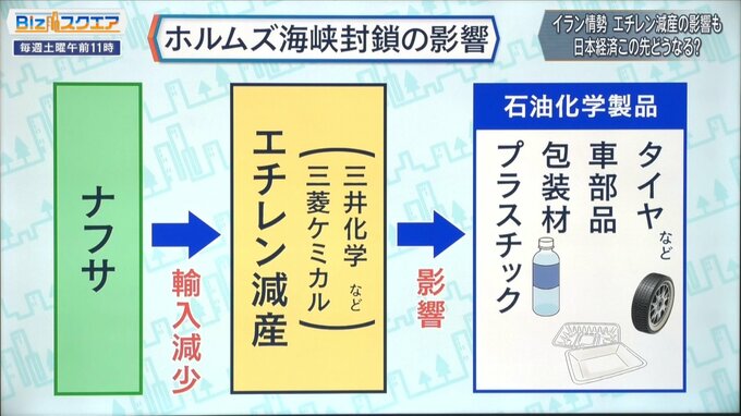 日本は原油から作られる「ナフサ」を中東各国から輸入しているが、そのナフサを原料に製造される「エチレン」がすでに減産に追い込まれている。