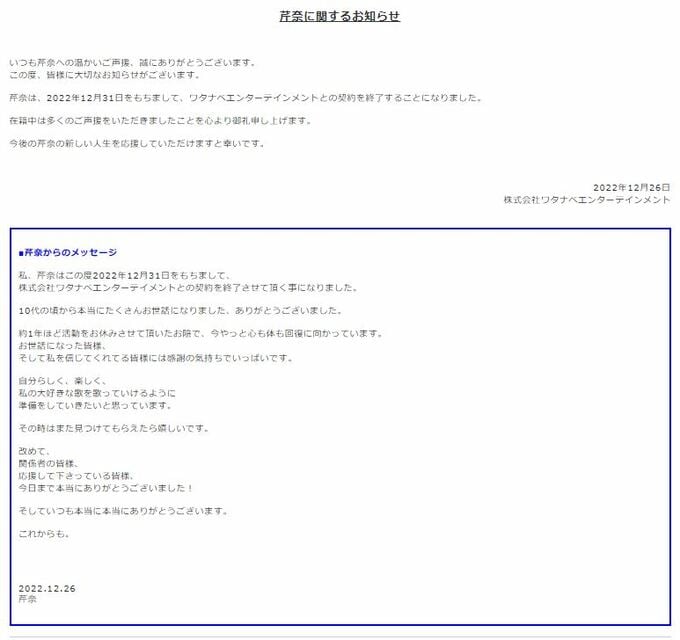 芹奈は、2022年12月31日をもちまして、ワタナベエンターテインメントとの契約を終了することになりました。