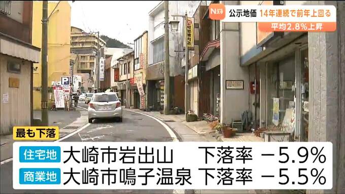 一方、最も下落したのは、住宅地が大崎市岩出山で下落率はマイナス5.9%、商業地は大崎市鳴子温泉でマイナス5.5%でした。