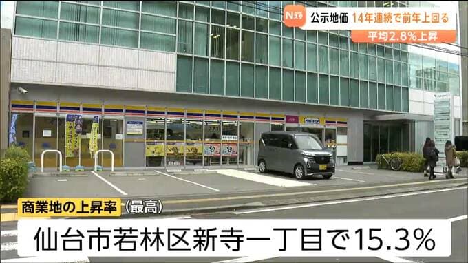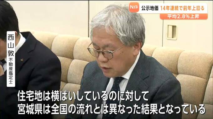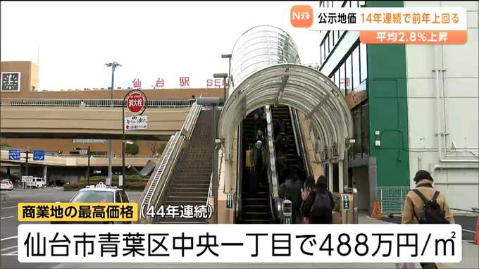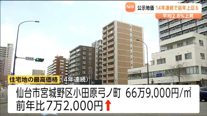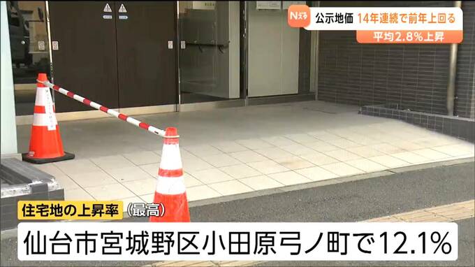 土地取引の指標となる公示地価が発表され、宮城県内の住宅地は平均で2.8%上昇し14年連続で前の年を上回りました。