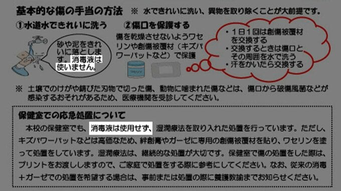 茨城県にある学校のほけんだよりでは、しつこいくらいに「傷は消毒しない」と書かれている。この学校だけでなく消毒液を使わない動きは広がっていて、いまや保健室に消毒液の存在すらないところも出てきているという。消える「消毒液」。いったいなぜなのだろうか。