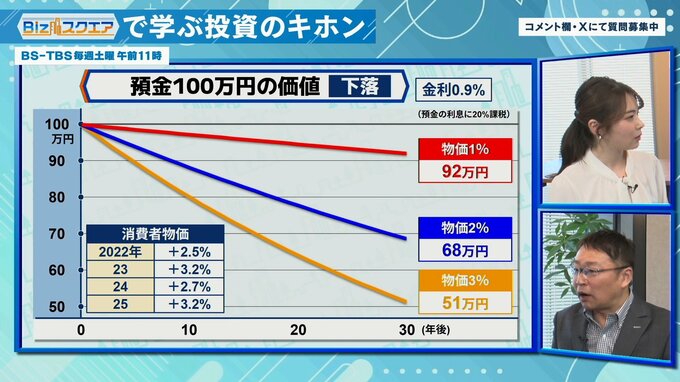 「この先2%のインフレが続くと、30年後には100万円が68万円の価値に。3%だと半分に減っちゃう。22年から3%近いインフレが続いていて、今後も食料やエネルギー、レアアースの奪い合いは世界中で続く。そう考えると、やはりインフレは一定程度続くと思っておいたほうがいいし、本当にインフレになった時のために多少備えておいた方がいいと思う」