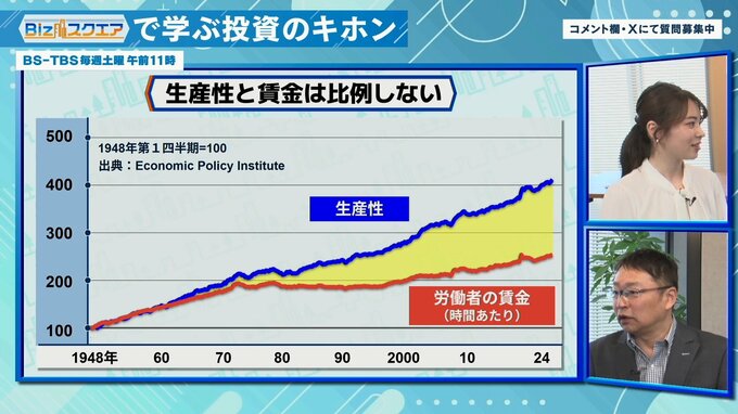 「労働者が頑張って仕事をして“生産性が高まっても、給料はたいして増えない”というアメリカのデータがある。2000年代はコンピュータやインターネットなどで生産性は上がったけど給料はそれほど上がってない、これが真実」