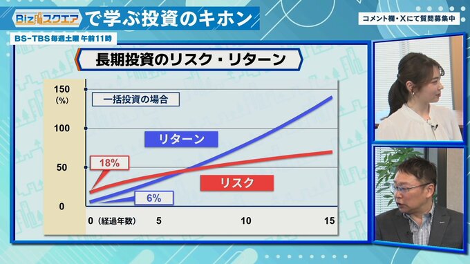 「リターンが年率6%、リスクが年率18%のケースで見ると、リターンの方は複利効果で加速度的に上がっていく。一方リスクは10年後に10倍の180%かというと全然そんなに増えない。リスクはそういうふうに計算されている」