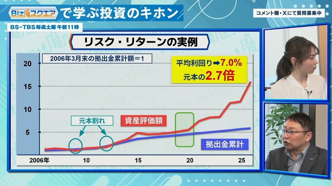 「資産の中身は7~8割が株で、実際に投資を始めてから10年以内は元本割れしたが、その後もずっと続けていたら2020年のコロナショックの時でも含み益で通過している。これは投資を始めてから15年後。その後も増えて、2026年3月時点で元本の2.7倍、平均利回り7.0%。最初のうちはなかなか増えないし元本割れするしでイヤになるけど、やめないで続けていたらという実例」