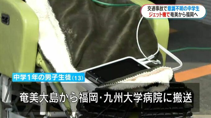 交通事故で意識不明となっている男子中学生が17日、奄美大島から福岡の病院へジェット機で搬送されました。NPOの取り組みで、鹿児島県内では初めてです。