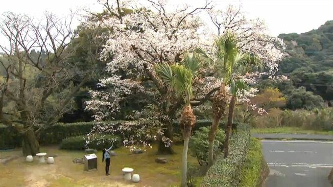 (レポーター)「およそ8メートルの立派なヤマザクラ、見上げると空一面に桜が広がっている」