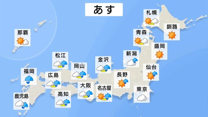 あすは低気圧が西から進んでくるため、九州から雨が降り出してきそうです。雨の降り出す時間帯は、九州・四国・中国では朝から、近畿は昼ごろ、東海は夕方から雨になるでしょう。関東や北陸、東北南部も、夕方から夜にかけて雨の所が多くなりそうです。九州や四国、近畿では雷を伴って強く降る所もあるでしょう。太平洋側の沿岸部では南風が強く吹きそうです。