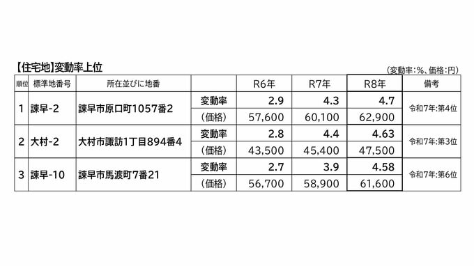 長崎県の令和8年地価公示 住宅地の平均価格は前年より上昇 長崎放送 2026年3月17日(火) 18:29 国内 住宅地で変動率が最も高くなったのは、諫早市原口町で4.7%上昇。1平方メートル当たり6万2900円でした。