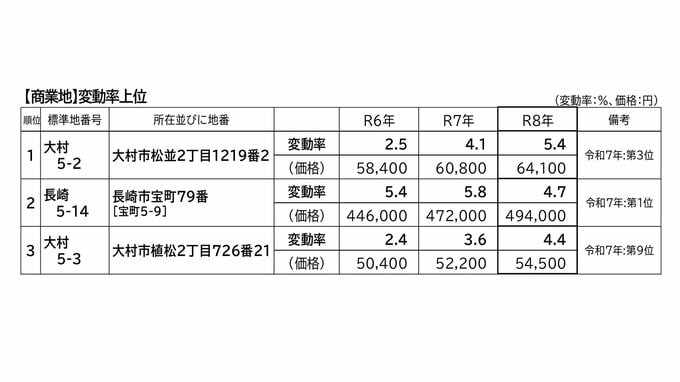 長崎県の令和8年地価公示 住宅地の平均価格は前年より上昇 長崎放送 2026年3月17日(火) 18:29 国内 一方、商業地の中で地価の上昇率が最も高かったのは大村市の松並2丁目で、5.4%上昇の1平方メートル当たり6万4100円。調査した不動産鑑定士は新幹線沿線の土地の需要の高さや人口増加が背景にあると分析しています。