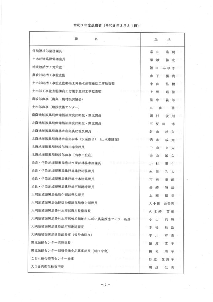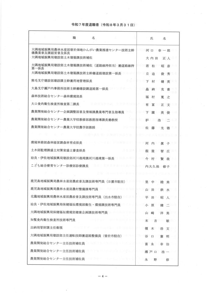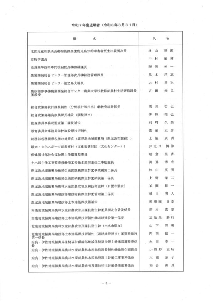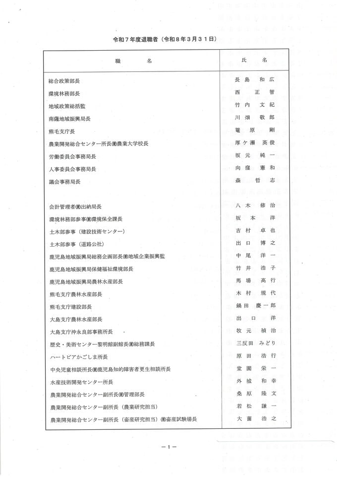 鹿児島県 人事異動一覧2026 退職者・再任用・新規採用【鹿児島県庁異動名簿】令和8年 南日本放送 2026年3月17日(火) 19:18 国内 鹿児島県職員 退職者名簿 画像はタップやクリックで拡大できます▼▼(リンク)部長級・部次長級~ ▼(リンク)部次長級続き~課長級 ▼(リンク)課長級~▼(リンク)課長補佐級・係長級・一般職員 ▼▼(リンク)部長級・部次長級~ ▼(リンク)部次長級続き~課長級 ▼(リンク)課長級~▼(リンク)課長補佐級・係長級・一般職員 ▼▼(リンク)部長級・部次長級~ ▼(リンク)部次長級続き~課長級 ▼(リンク)課長級~▼(リンク)課長補佐級・係長級・一般職員