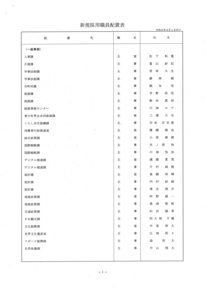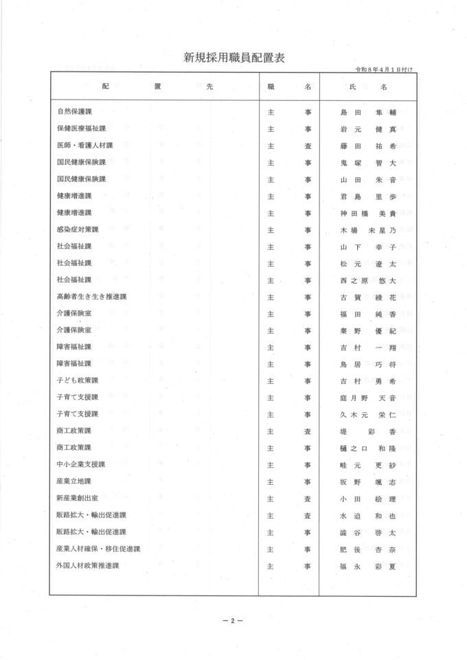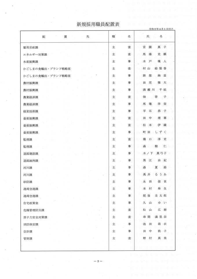 鹿児島県 人事異動一覧2026 退職者・再任用・新規採用【鹿児島県庁異動名簿】令和8年 南日本放送 2026年3月17日(火) 19:18 国内 新規採用職員の配置表 鹿児島県 画像はタップやクリックで拡大できます ▼▼(リンク)部長級・部次長級~ ▼(リンク)部次長級続き~課長級 ▼(リンク)課長級~▼(リンク)課長補佐級・係長級・一般職員