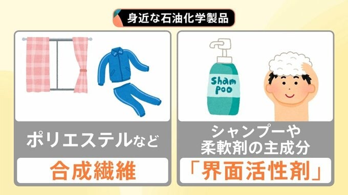▼ポリエステルなどの「合成繊維」、▼シャンプーや柔軟剤の主成分「界面活性剤」も身近な石油化学製品です。