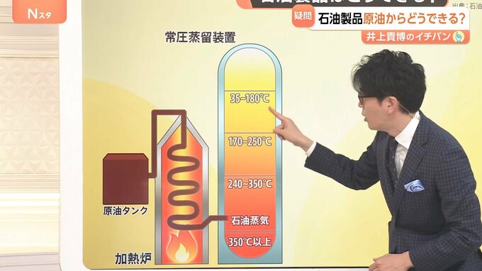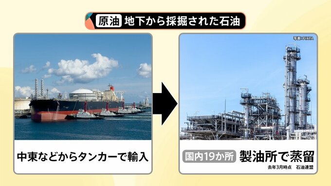 石油は地下から掘り出され、中東などからタンカーで輸入されます。そして、輸入された石油は、国内に19か所ある製油所で蒸留するということです。