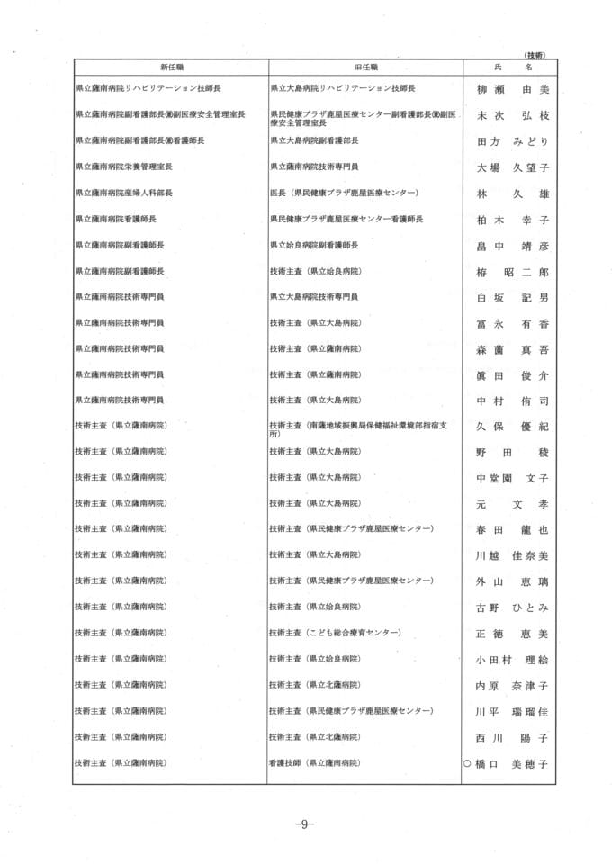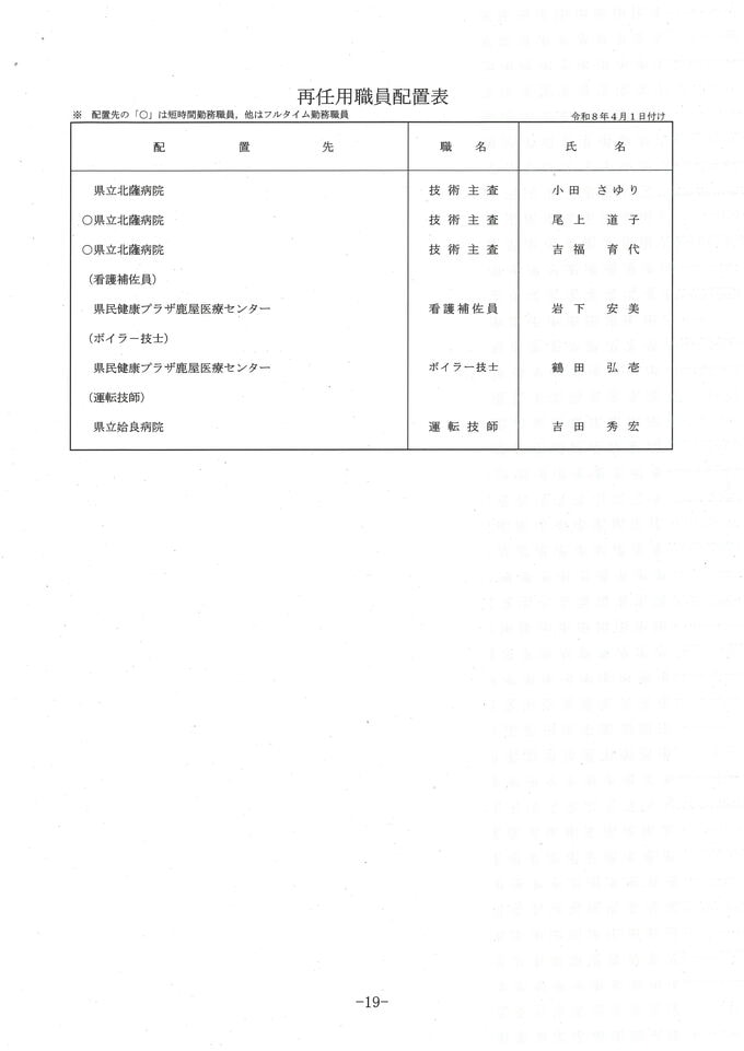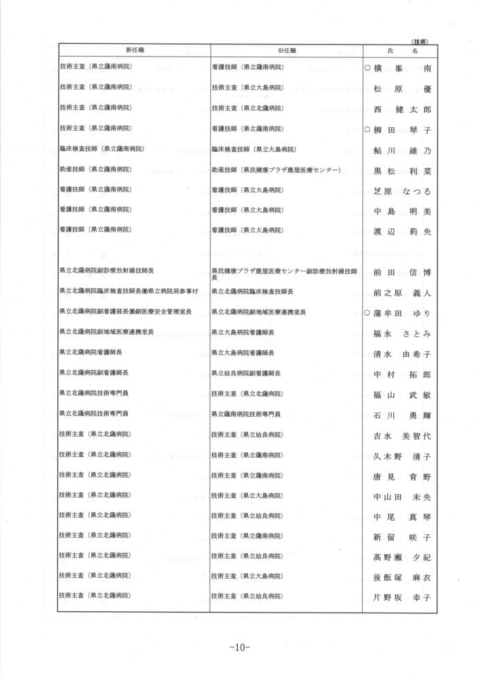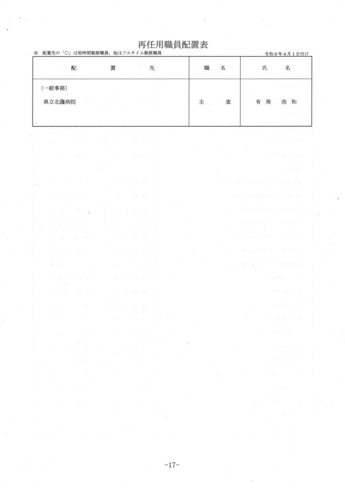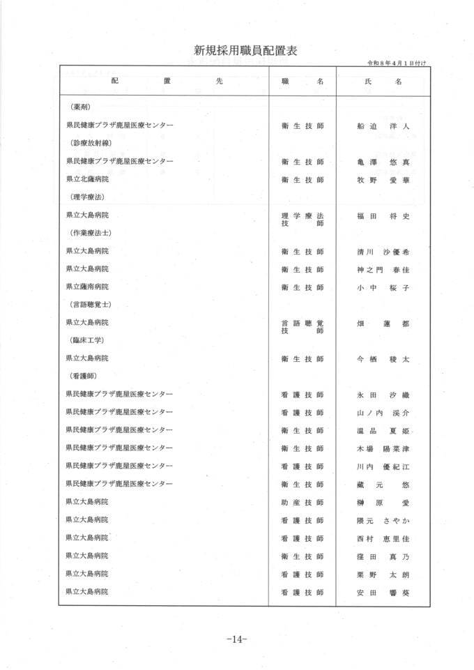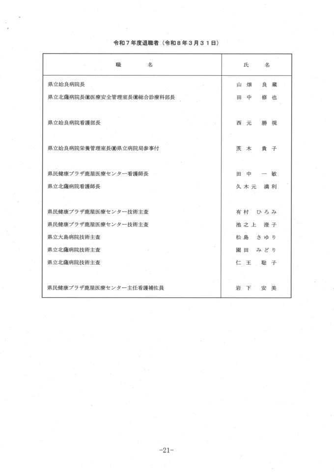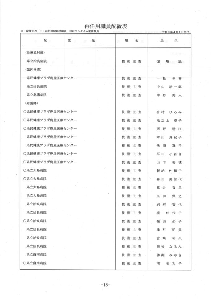 【県立病院局の人事異動一覧】令和8年鹿児島県人事異動名簿2026 南日本放送 2026年3月17日(火) 20:27 国内 新規採用職員 名簿 画像はタップやクリックで拡大できます 再任用 画像はタップやクリックで拡大できます 退職者