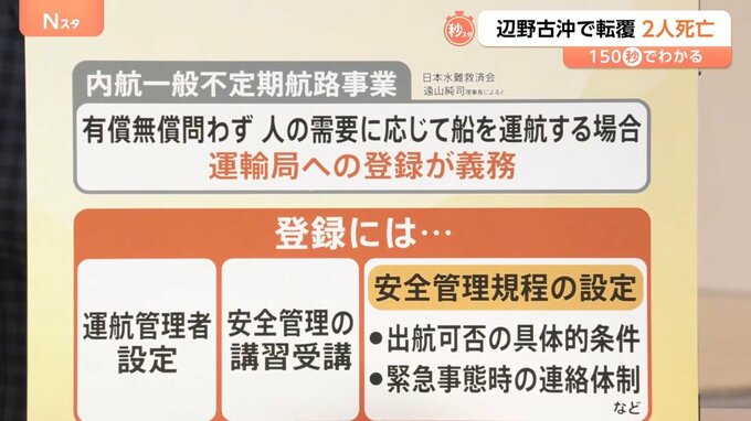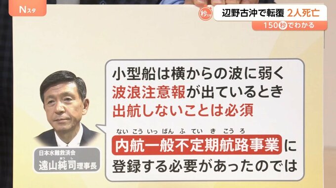 日本水難救済会の遠山純司理事長は「小型船は横からの波に弱く、波浪注意報が出ているとき出航しないことは必須。『内航一般不定期航路事業』に登録する必要があったのでは」と指摘しています。